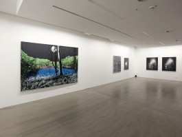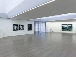 Die historische Entwicklung wird zum Anlass eines künstlerischen Prozesses, in dem das Abbildhafte in den Hintergrund tritt, um sich dem Veränderungspotenzial der Dinge zu nähern. Was auf die Arbeiten Steinmanns zutrifft, gilt in hohem Maße für die Bilder von Birgit Jensen. Auch Jensen geht von der Gegenwart aus. Über Jahre besuchte sie immer wieder verschiedene Orte in Ratingen, die Verbindungen bis in die prähistorische Zeit für sie herstellten. Dabei kristallisierte sich als besonders markantes Gebiet der heutige Blaue See heraus. Er wurde zum zentralen Ort ihrer künstlerischen Nachforschungen. Der See aus dem Urelement Wasser, mit seiner markanten Felswand, die das Innere des Erdreichs offenzulegen scheint, als „Naturbühne“ vermarktet und doch ein Ort von Menschenhand geschaffen. Für Jensen ist der See gerade durch die so offensichtliche Transformation der Landschaft ein Symbol für den Lauf der Zeiten, der sich in der Veränderung manifestiert. Sei es durch die Erwartungen und Bedürfnisse des Menschen, sei es durch die Kräfte der Natur. Sein heutiges Erscheinungsbild verdankt das Gebiet des Blauen Sees im Wesentlichen dem Kalkabbau. Denn bis 1932 war hier ein Steinbruch. Es entstand eine tiefe Senke. Und wie eine Antwort der Natur füllte diese sich mit Grundwasser, so dass der heutige See entstand. Auch die typische Felswand ist ein Relikt des Steinbruchs. Dieser dominierte in seiner industriellen Ausprägung die Umgebung mit Brennöfen und Eisenbahnschienen, die nach der Aufgabe des Abbaus ihrerseits wieder überwuchert und bewachsen wurden von Bäumen und Gehölz. Der Ort der Arbeit mutierte zu einer Landschaft der Erholung. Das auf diese Weise langsam geformte Erscheinungsbild änderte sich abermals, diesmal schlagartig, als am 9. Juni 2014 der Sturm „Ela“ in einer breiten Schneise durch das Gebiet zog und anstelle der zuvor mächtigen Bäume nichts als ein undurchdringliches Dickicht hinterließ.