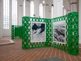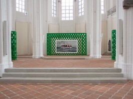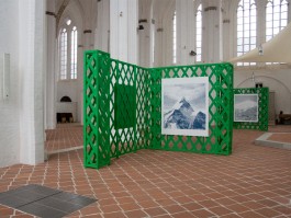 So werden auch in den Bildern von Birgit Jensen die seit Jahrhunderten kaum veränderten Sujets nicht 1:1 vermittelt. Sie sind in eine artifizielle Bildsprache übersetzt. Sie beschreiben Orte, die mit Bedeutung und Geschichte beladen sind - Berg, Tempel, Mauer und Bergwerk. Aus dem Kirchenraum sind diese deutlich zu erkennen. Sie gewinnen mit zunehmender Distanz des Betrachters an Dreidimensionalität. Aus der Nähe betrachtet verwandeln sie sich in Muster von zweidimensionalen Zeichen. Das gegenständliche Schein-Bild löst sich auf. Die Nahsicht zeigt eine Fülle unterschiedlich geformter Rasterpunkte - Mikroformen, von denen jede eine durch den malerischen Gestus bedingte individuelle Erscheinung aufweist. Die zur Abstraktion geschrumpfte räumliche Welt kommt erst in der Erinnerung wieder empor.