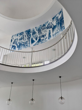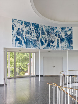 Birgit Jensen zeigt auf der gewölbten Wand der Rotunde im Hentrichhaus die großflächige Cyanotypie „Infinitesimal Movement“. Aus zehn Papierbahnen zusammengesetzt entfaltet sich das Bildmotiv als fortlaufende Komposition. Damit erinnert es u. a. an das Jacobizimmer mit seiner Bildtapete aus dem 19. Jhdt..